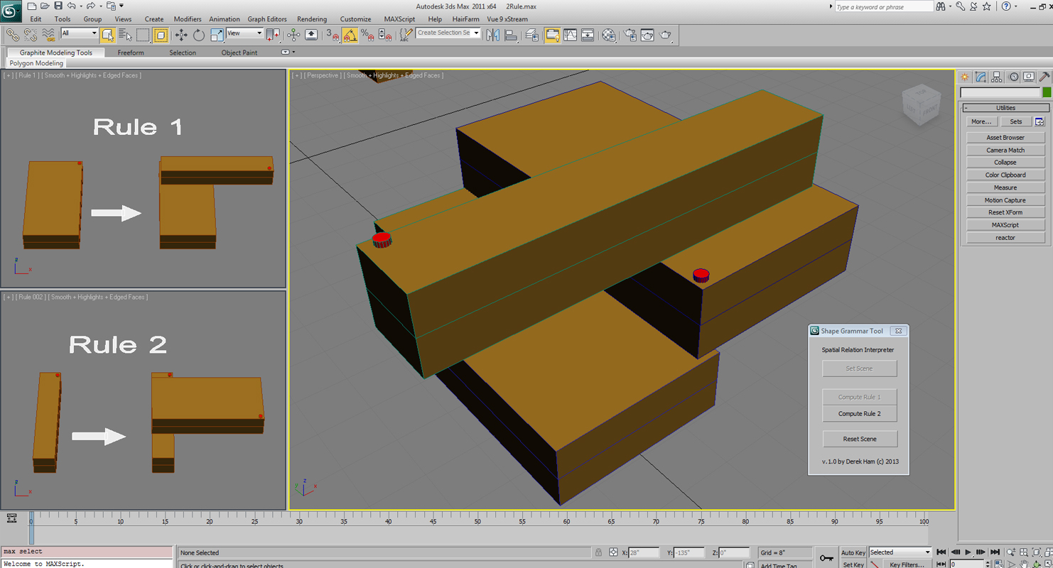 Using the scripting language of Autodesk’s 3D Studio Max. Witht the software a tool was developed that allows designers to explore basic Shape Grammar’s in the same way students play with the kit of parts.