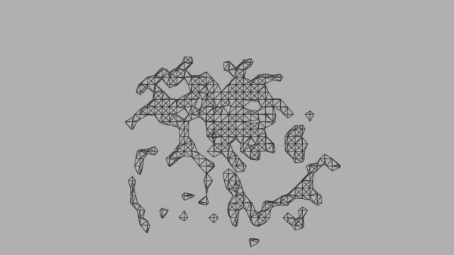 In the environment we place attractor nodes and reflective nodes and watch the particles swim around in the space. As the particles come within close proximity to each other they attract fuse together like water droplets. The result of the process is a cell like shape that is constantly trying to find its equilibrium.